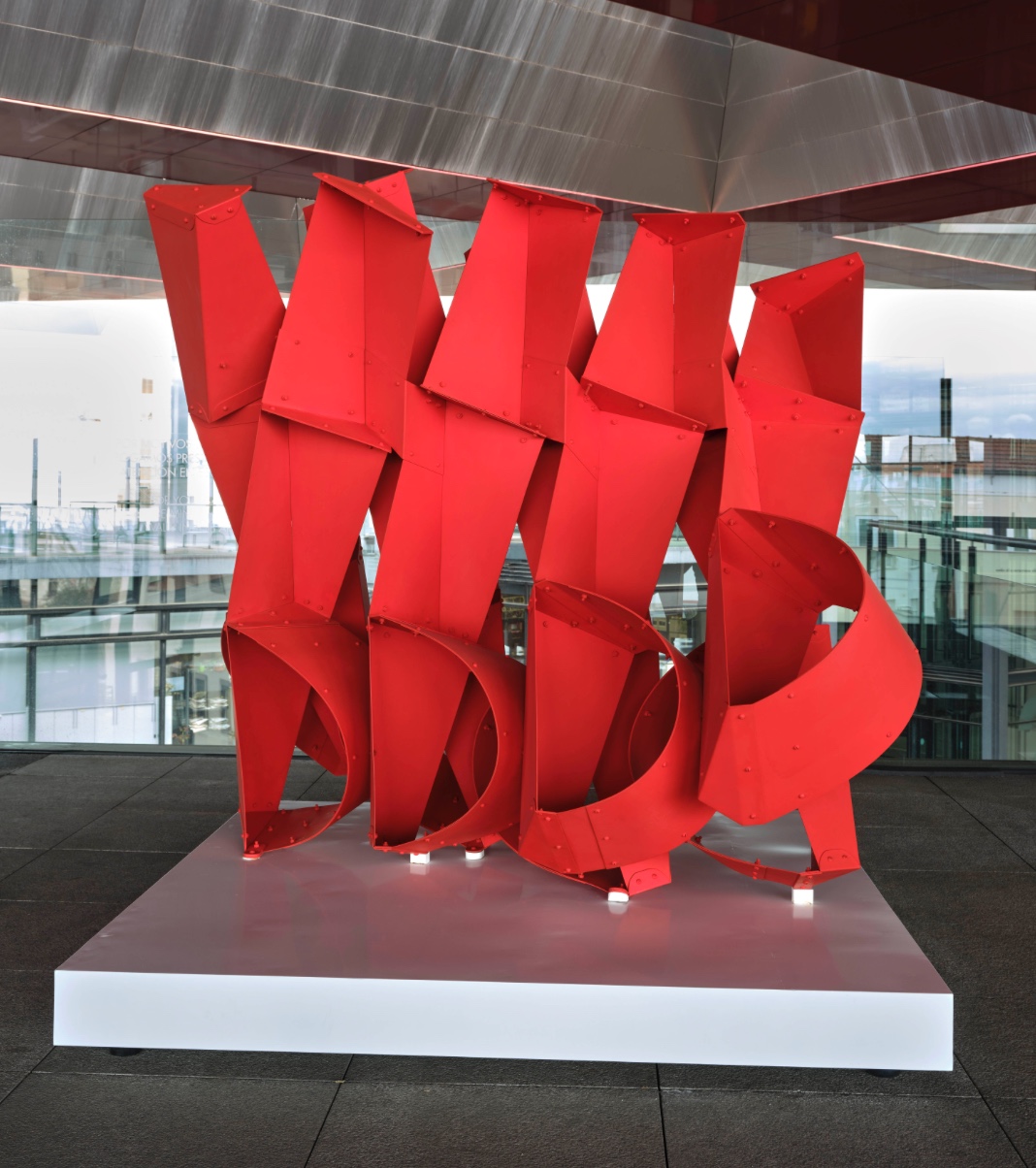 Finalment, Vigilante rojo d’Edgar Negret (Popayán, 1920 - Bogotà, 2012) destaca per la seva combinació de formes geomètriques amb una estètica industrial. L'escultura, realitzada en xapa d’alumini pintada, està formada per deu elements columnars disposats en seqüència parabòlica. La seva composició convida l’espectador a explorar-la des de diferents angles, ressaltant la dimensió cinètica de l’obra.