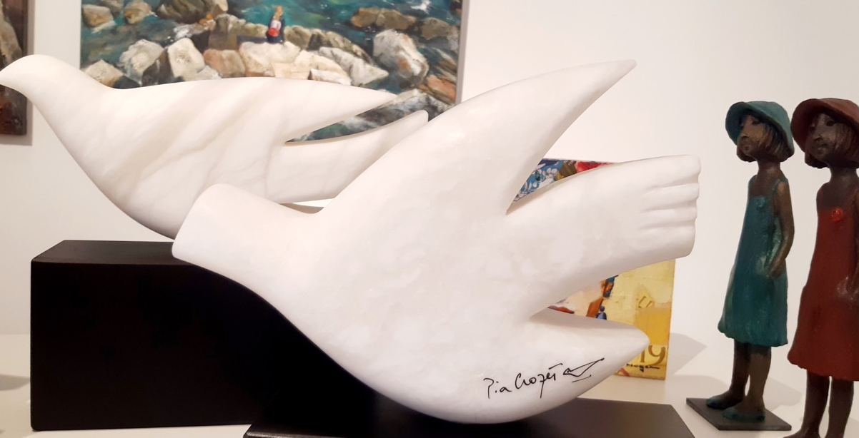La coneguda escultora francesa Pia Crozet exposa fins a finals de juliol del 2020 la sèrie Coloms de la pau a la galeria Dual de Girona. Les escultures que segons Crozet "són un cant a la pau i una reacció a les injustícies del nostre temps i una esperança per un futur millor", estan fetes a mà amb alabastre.