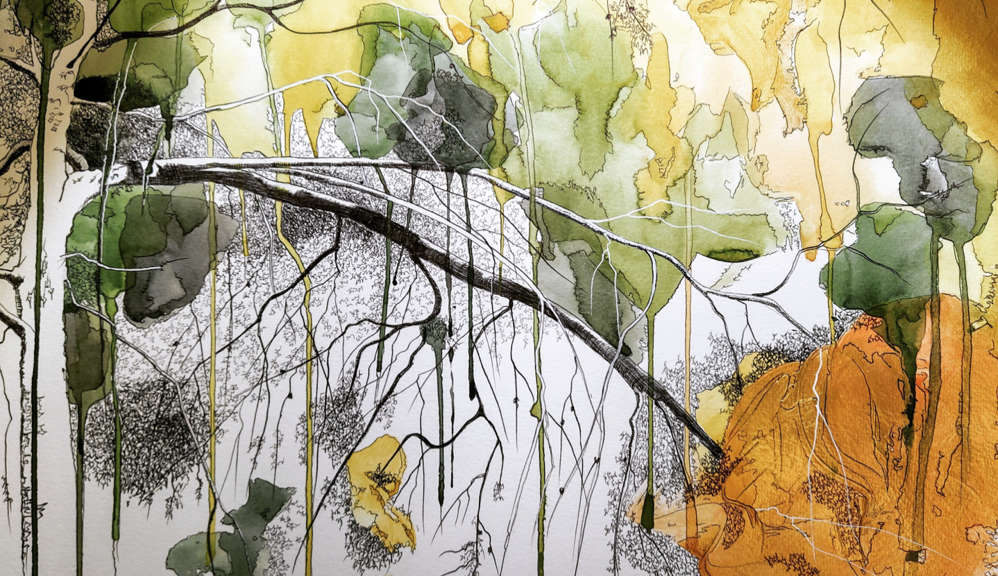 La natura es trenca! Els arbres com a nexe entre aquest, el nostre món terrenal, on el poc respecte per la natura és evident i l'espiritual, on la llum, el color, la llibertat, l'esperança, ens guien cap a unes escenografies a mida, on poder perdre en un submón paralelo.Una necessitat, una opció de poder amagar-se, un somiar despert on el seny ens guiï cap a un món millor. Un cortinatge de llàgrimes i branques, que només deixen entreveure, el que un vol. Un filtre on la taca dóna pas a les formes naturals, convertint la improvisació en intenció. El color pren el protagonisme, el daurat serà l'encarregat a remarcar la importància del que s'està parlant, és la sang de l'esperança, és la força de el sol, en definitiva el poder de la natura".