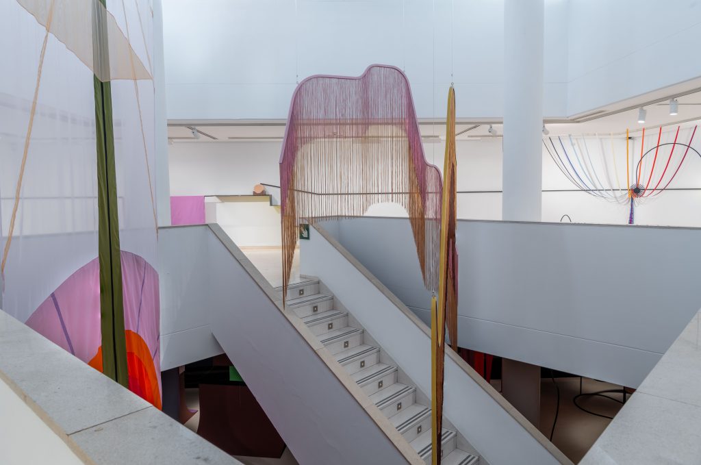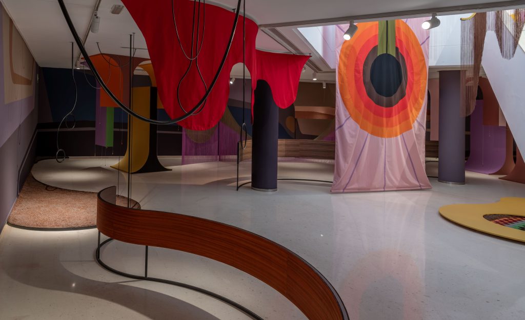 Canepa dona forma a aquests “espais de confluència simbòlica on dialoguen la mitologia clàssica i les cosmologies indígenes andines”, va detallar Blanca De la Torre, un plantejament construït, precisament, a base de capes. La primera, però no menys rellevant, parteix d’una experiència estètica en què els colors vius i les figures geomètriques marquen el ritme d’una sala suggerent que sembla poblada per peces de joguina.