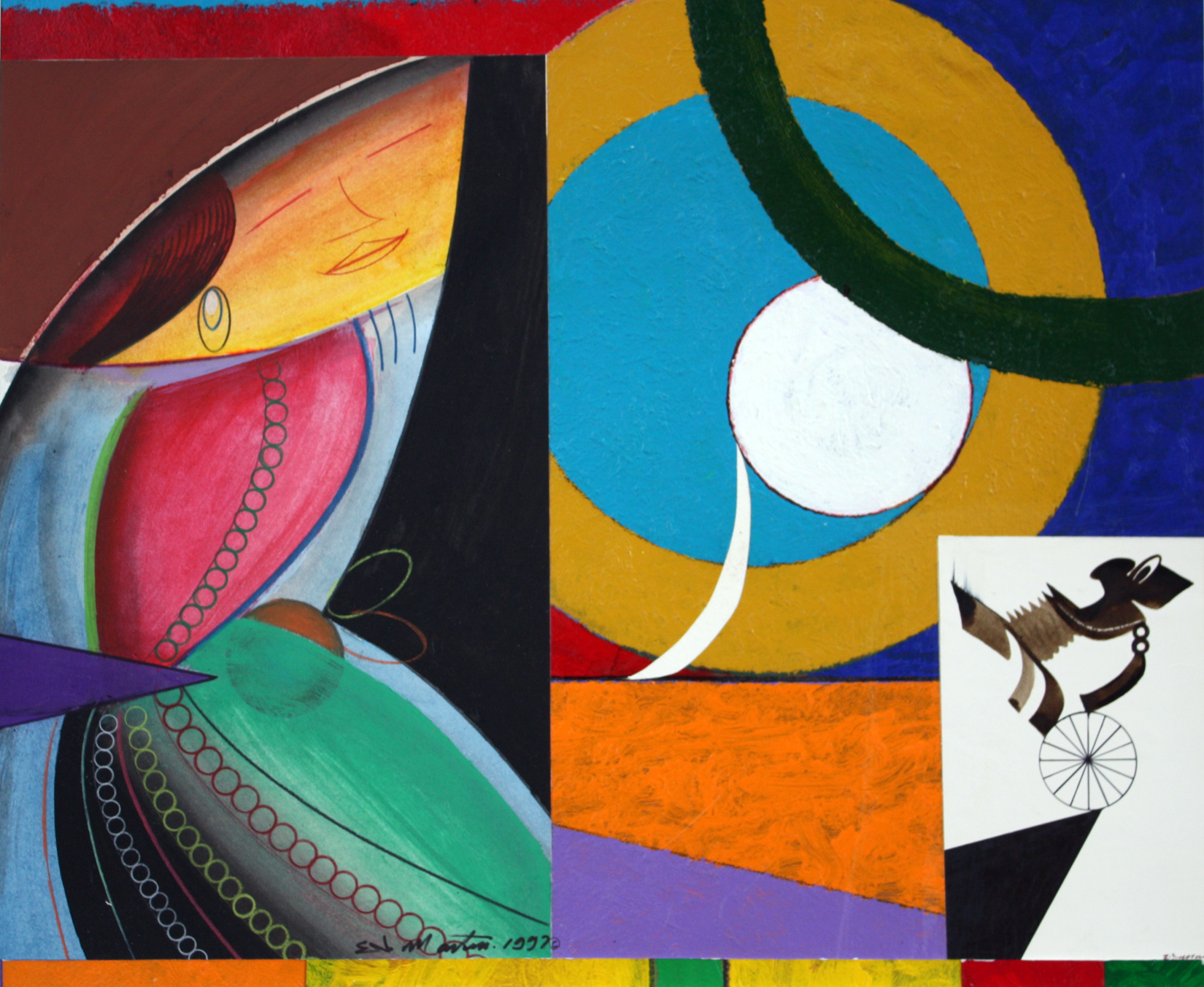 Més enllà dels colors vius i del caràcter lúdic de les formes abstractes, Eugene James Martin construeix, a través d’aquestes combinacions singulars, una visió profundament personal del món. La seva trajectòria es va desenvolupar de manera solitària, al marge d’escoles i corrents establerts. En un context dominat pel Pop Art i el Minimalisme als Estats Units, Martin va mantenir-se fidel a una visió pròpia, sense renunciar mai al seu llenguatge ni atribuir a la seva obra una voluntat política explícita.