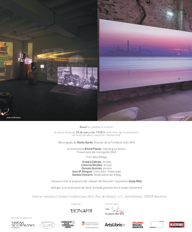 El pròxim dimecres 25 de març a les 19:00 h, Bonart obre les portes de l’Auditori de la Fundació Joan Miró per presentar les seves dues revistes més recents: la número 203 nacional i la número 2 internacional. L’acte començarà amb la benvinguda de Marko Daniel, director de la Fundació, seguida de la intervenció de Ricard Planas, CEO del grup Bonart.