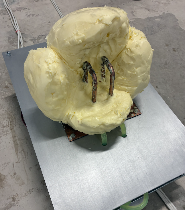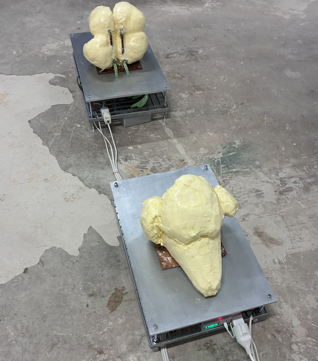 La mantega es consolida, així, com un material idoni per a l’articulació discursiva de l’exposició. Tot i això, es tracta d’un material problemàtic en si mateix: és un aliment que requereix una elevada producció ramadera i industrial. Conscient d’aquesta contradicció, l’artista ha optat per fer ús de minves de mantega industrials, incorporant així una reflexió sobre l’aprofitament de recursos en l’art contemporani.