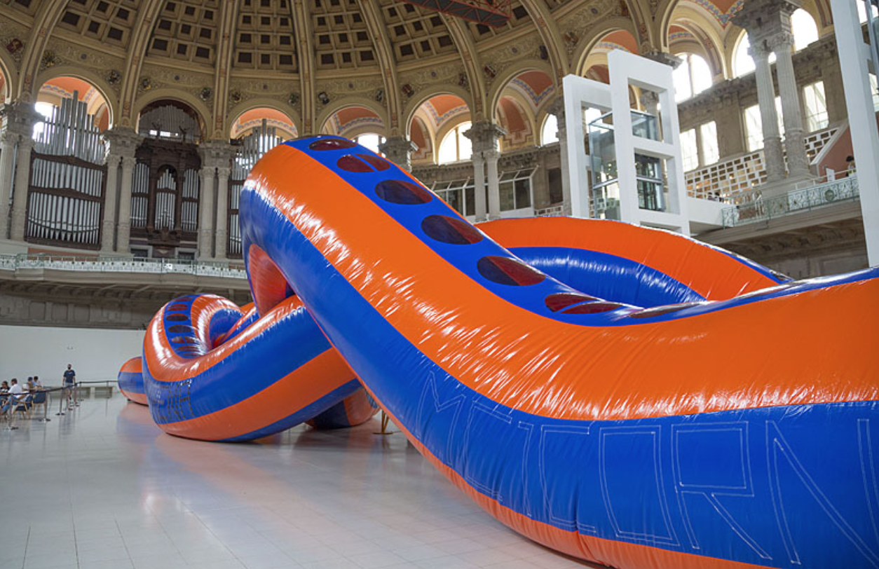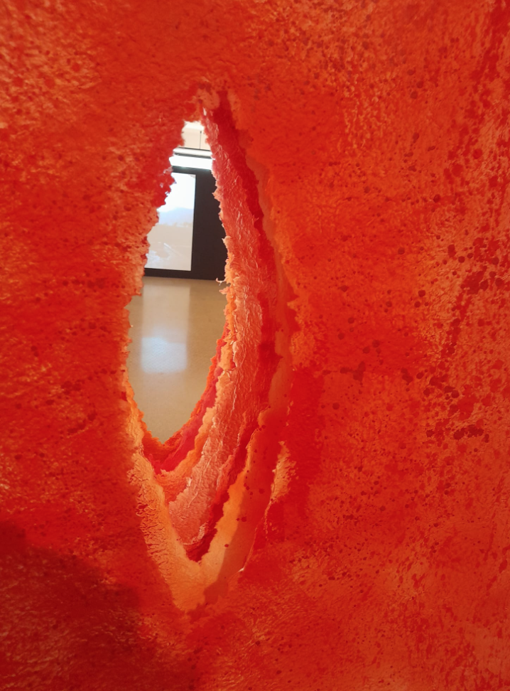 En la escultura Ser matriz, hecha con varios papeles artesanales pintados rojo, el artista arranca el centro formando una forma romboidal que al ser varios papeles recuerda al útero.