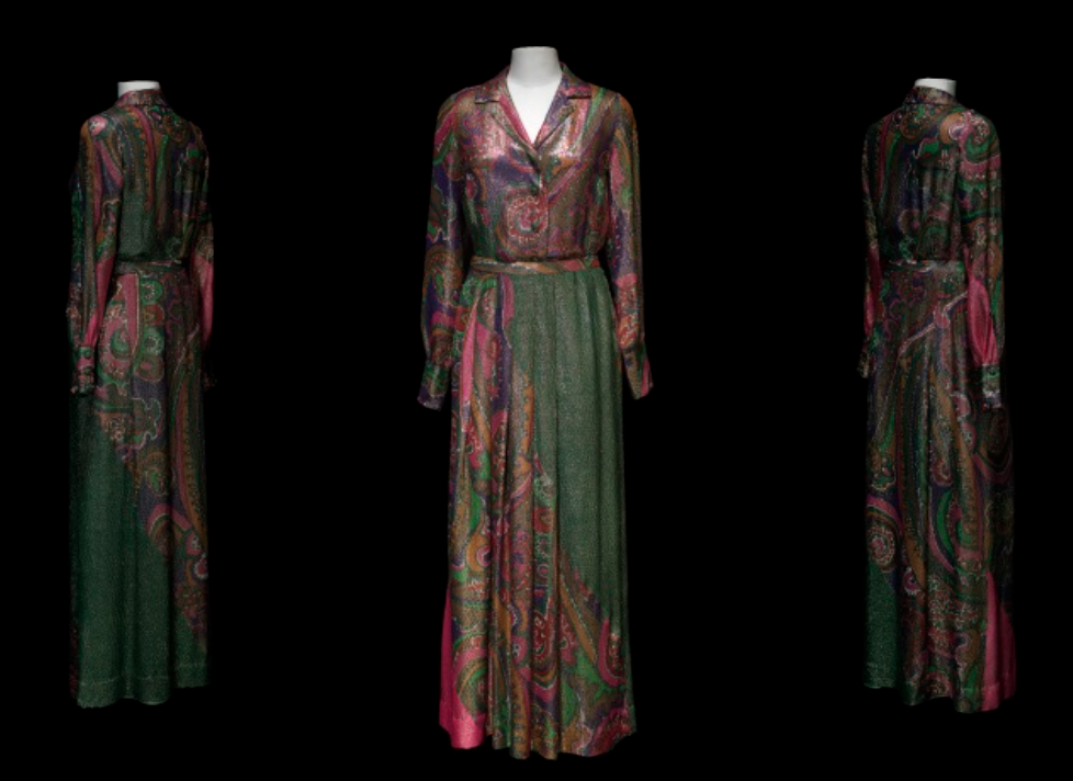 Conjunt que havia pertangut a Gala, format per una brusa i una faldilla llarga de lamé amb estampat de caixmir. Christian Dior Boutique, c. 1971.