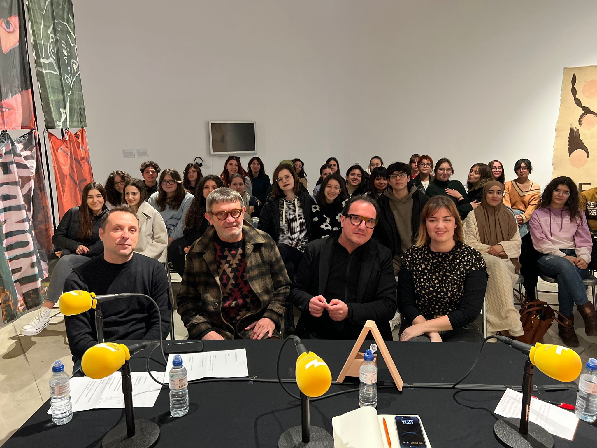 Ricard Planas, Rafa Tormo, David Escamilla i Aida Boix amb els estudiants de l'Escola d'Art i Disseny d'Amposta.