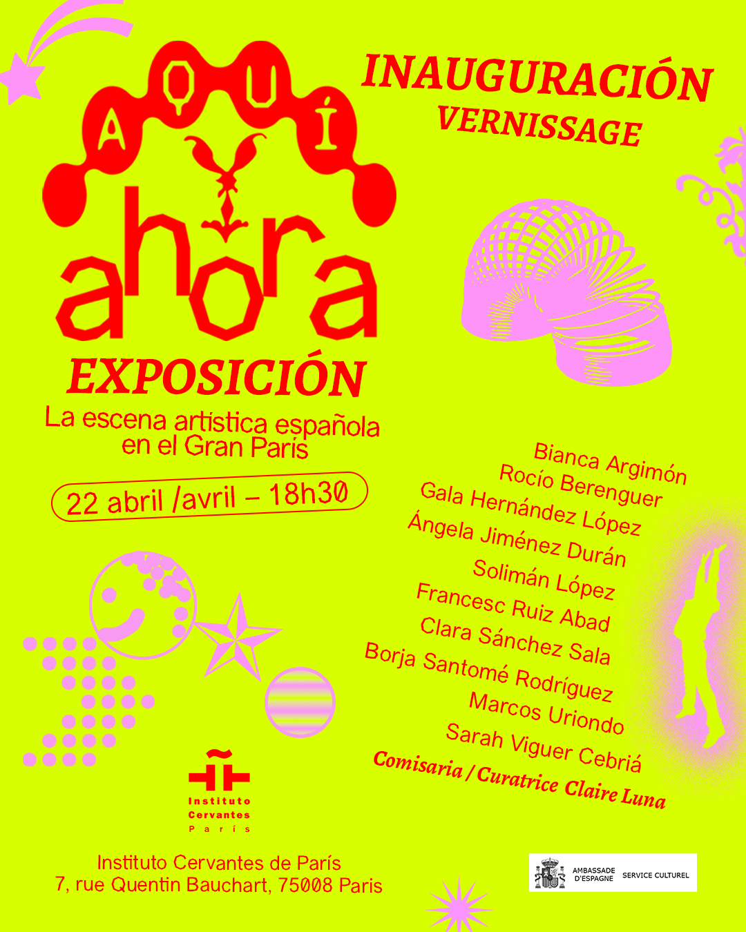 Como primera acción dentro de este proyecto, el Cervantes presenta la exposición Aquí y ahora, una muestra colectiva que reúne a diez artistas españoles emergentes que forman parte de la dinámica cultural parisina actual: Bianca Argimón, Rocío Belenguer, Galán Hernández López, Ángela Jiménez Durán, Solimán López, Francisco Ruiz Abad, Clara Uriondo y Sarah Viguer Ceribá .