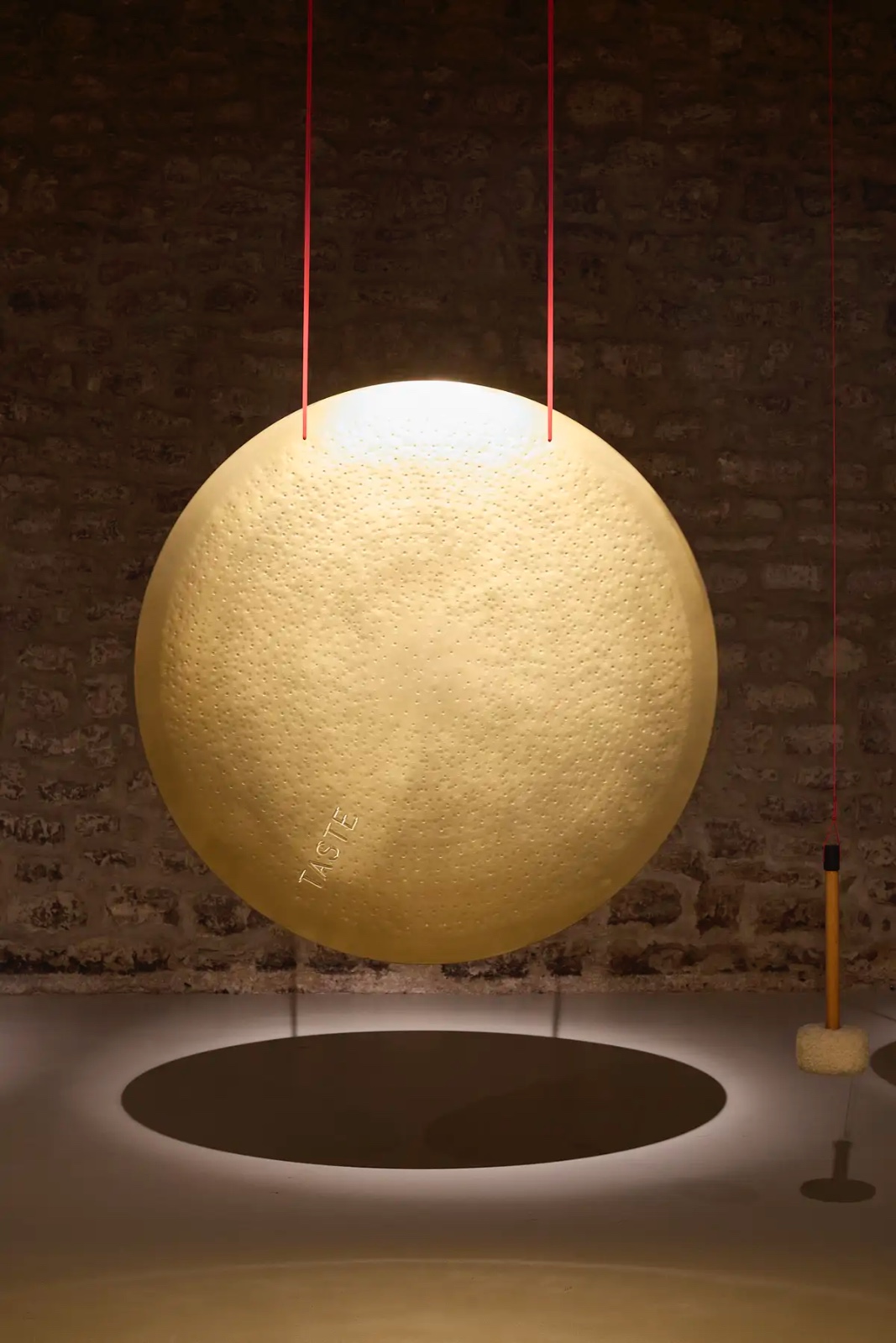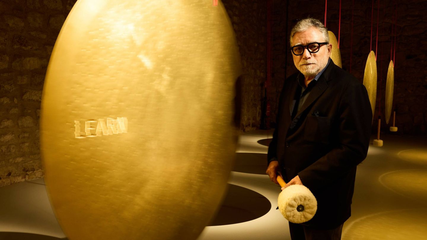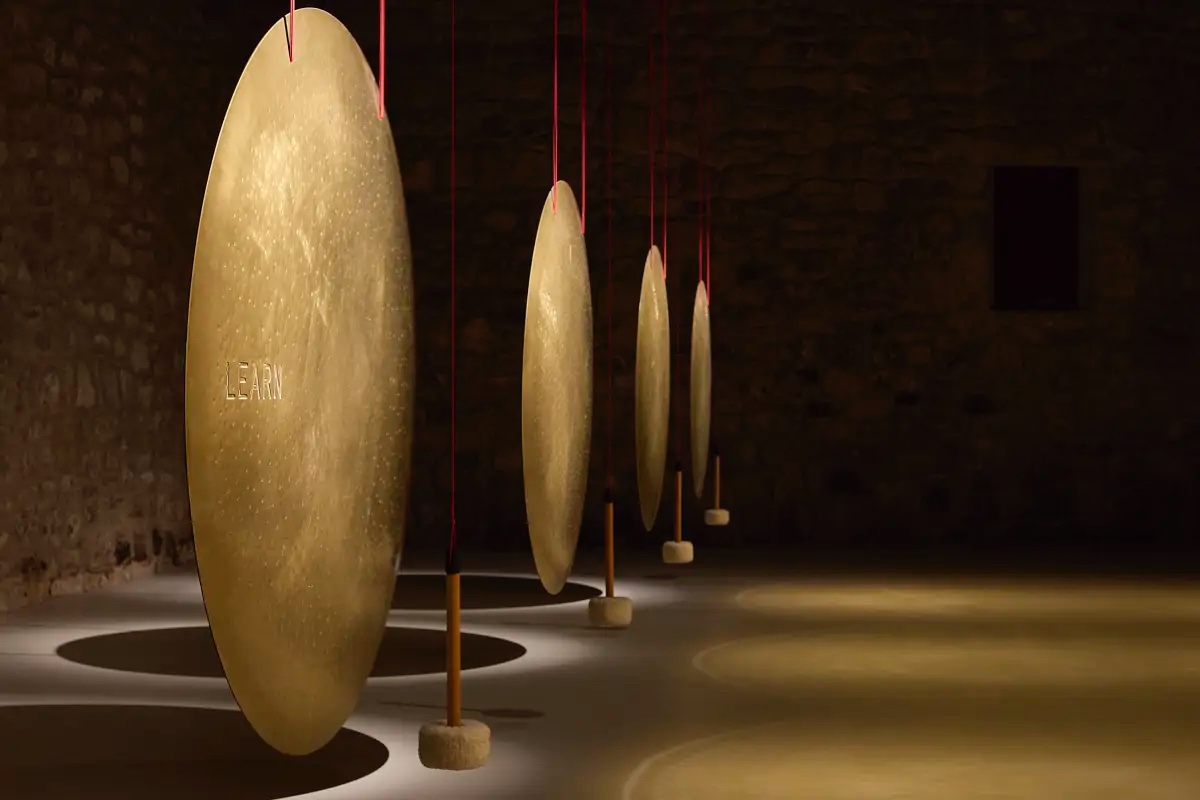 La obra consta de 24 gongs colgados, uno por cada hora del día, cada uno con una palabra en inglés grabada. El público es invitado a interactuar con ellos, a hacerles sonar y dejar que la vibración resuene por el cuerpo y por el espacio. Aunque Plensa suele asociarse a esculturas de rostros femeninos y encerrados en sí mismos, esta propuesta mantiene algunos de los elementos que le caracterizan. Los gongs, como las figuras, guardan un silencio cargado de significado, emanan una energía contenida que invita a la introspección. Son obras distintas, sí, pero animadas por una misma filosofía poética. Rocío Plana Freixas, historiadora del arte y conocedora de su obra, dice que “Plensa ha trabajado anteriormente con gongs en lugares vinculados al agua y los fluidos, y hay algo atávico en esta conexión”. En una bodega como ésta, rodeada de líquidos que también requieren tiempo y reposo, la pieza también encaja.