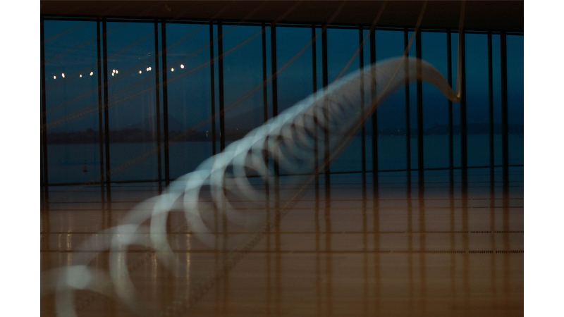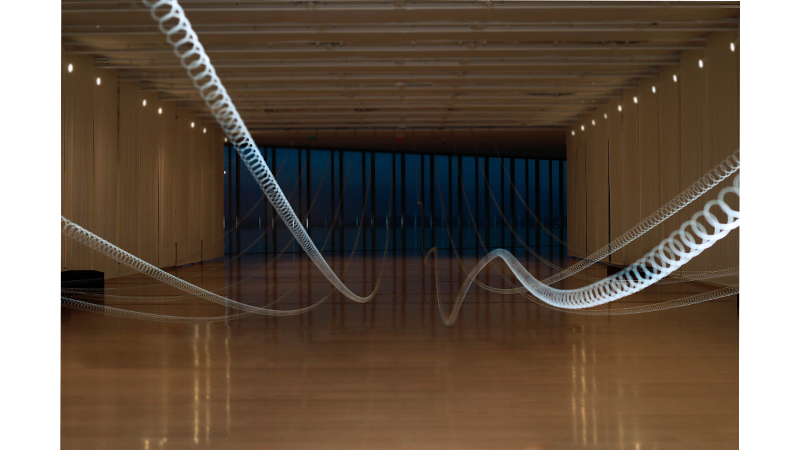 Para esta instalación, que se podrá ver hasta el 1 de marzo, las historias, ritmos y patrones de once olas desaparecidas se transforman en una composición musical y en una coreografía de once muelles suspendidos, activados por intérpretes en un bucle continuo. El gesto repetido, casi ritual, traduce el movimiento ausente del mar en una presencia física y sonora.
