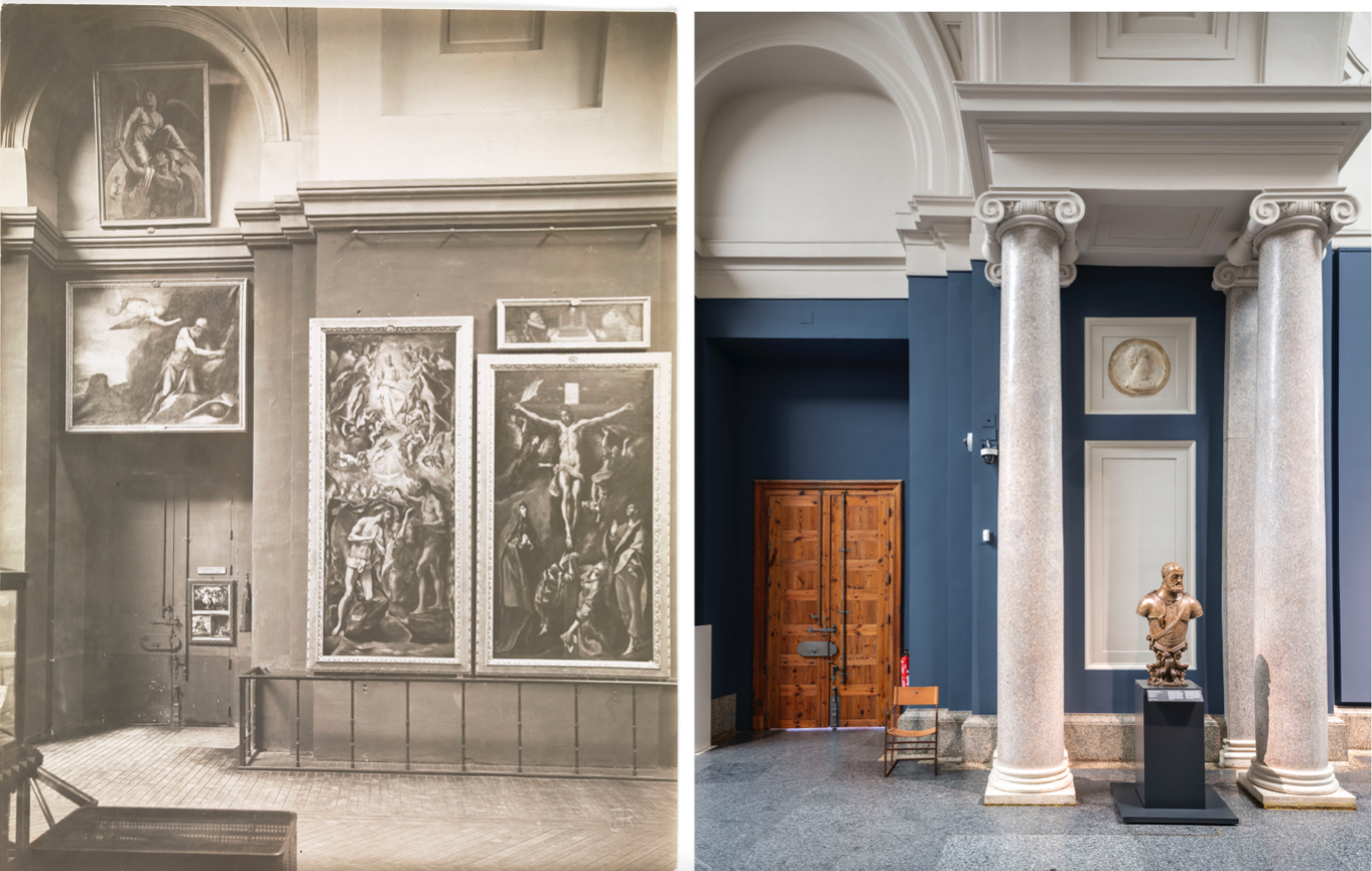 Vista de la galería central del Museo del Prado con establecimiento para la venta de fotografías HF-1229 y vista actual Foto © Museo Nacional del Prado.