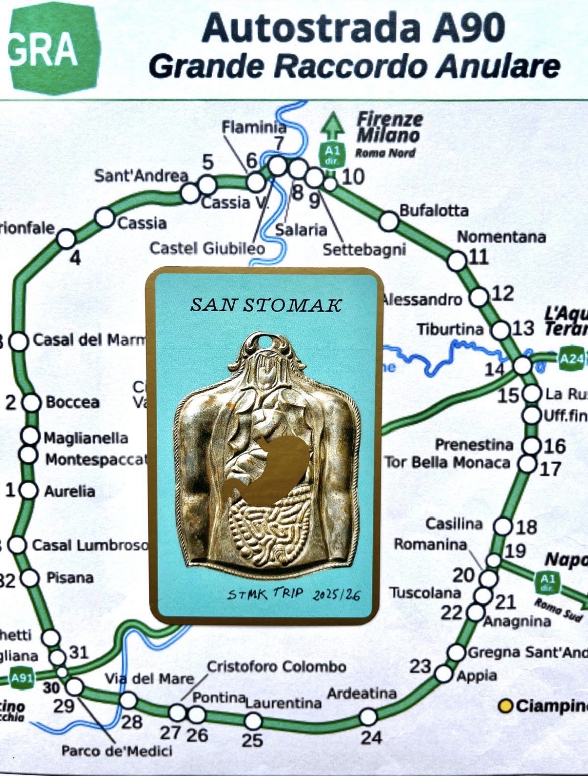 La jornada se estructuraba en tres momentos. Comenzaba al amanecer, a las 06:00 h, con la salida desde la Real Academia de España en Roma en dirección al Grande Raccordo Anulare, el anillo de circunvalación que rodea la ciudad. Este recorrido inicial plantea el GRA como dispositivo simbólico desde el cual repensar la relación entre centro y periferia, transformando esta infraestructura en un paisaje ritual que Sant Stomak “devora” en un gesto circular.