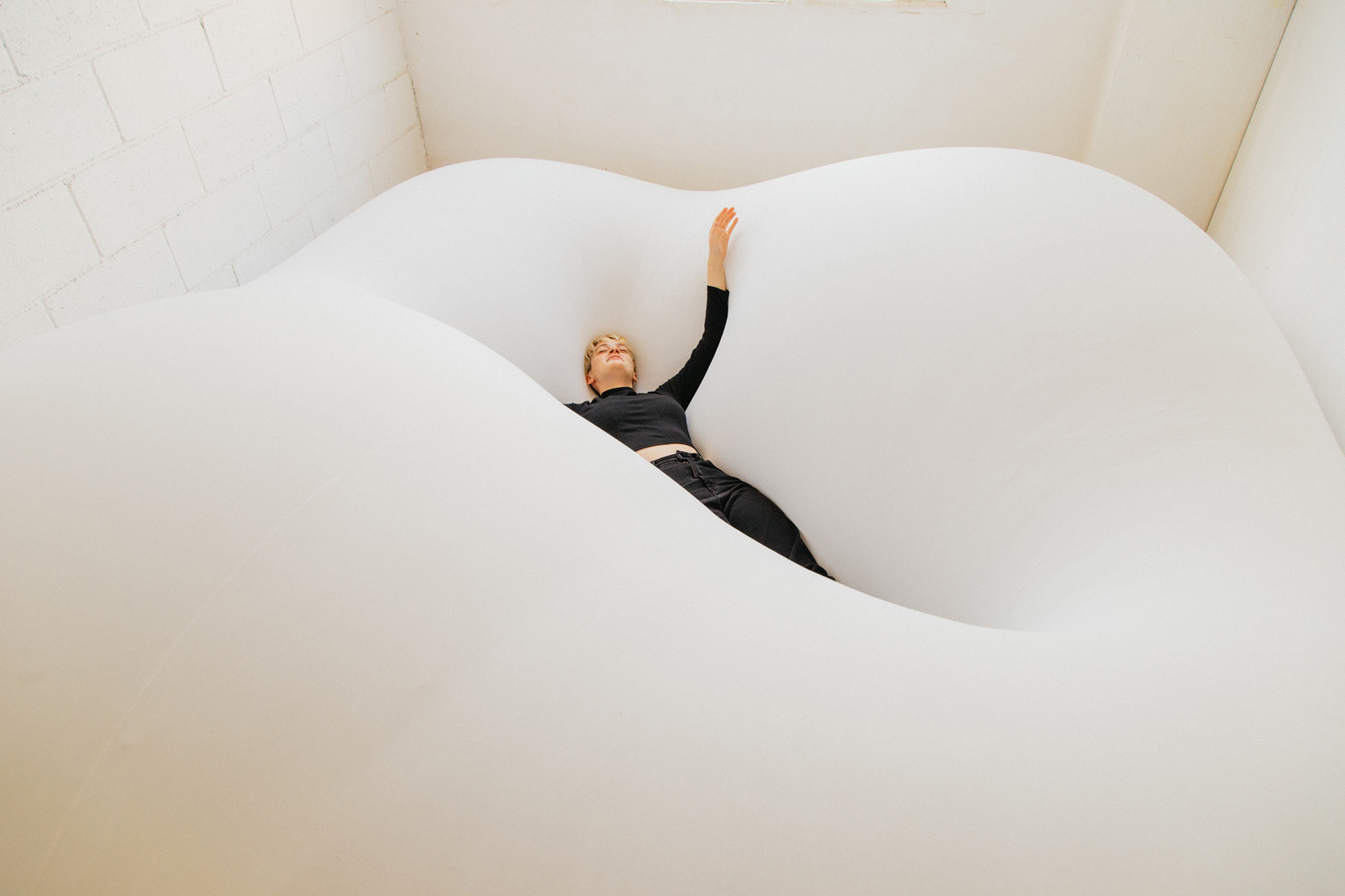 Anna Irina Russell (Barcelone, 1993) présente sa nouvelle exposition Un contagion à Bombon Projects. L'artiste a consacré ces dernières années à jouer — littéralement — avec la communication, mais à partir de lieux qui échappent aux codes habituels et hégémoniques. Russell utilise la sculpture et l'installation pour transformer ces formats en outils de transmission. Ses pièces, souvent souples, gonflables et presque organiques, nous interpellent par leur présence instable. Ce sont des formes qui respirent, se contractent et se dilatent, ouvrant un espace pour repenser le corps et ses possibilités. « Les corps nés du corps d'Anna Irina Russell sont des corps qui battent, qui respirent, qui gonflent pour communiquer avec nous », écrit Blanca Arias dans le livre Tomar aire, publié par Brillo.