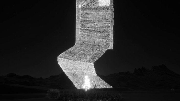 Inspirada en la serie Hiperespacio, la muestra despliega atmósferas monocromas atravesadas por líneas blancas que generan composiciones dinámicas, haciendo que el espacio cobre vida y parezca latir como un organismo. El recorrido culmina con Forest Goddess, una figura colosal cuya piel combina elementos naturales y tecnológicos, simbolizando la conexión entre humanos, tecnología y naturaleza.