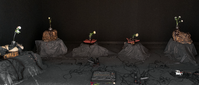 Por su parte, Marco Henri presenta H-VC1JD, una videoinstalación inmersiva que recontextualiza material visual y sonoro encontrado en la red, activando nuevas capas fantasmagóricas de significado y explorando la cualidad objetual del sonido y su relación azarosa con la imagen. Gema Quiles propone en El Banquete una escena exuberante y crítica, un jardín festivo donde exceso, consumo y violencia emergen bajo una apariencia lúdica que cuestiona la plenitud contemporánea. Finalmente, Sandra Mar despliega Los Encuentros, un recorrido poético en forma de laberinto de esculturas-texto, donde el barro, el metal y el poliestireno dan cuerpo a relatos sobre el amor, el deseo y la intimidad, inspirados en la memoria romántica del cenador.