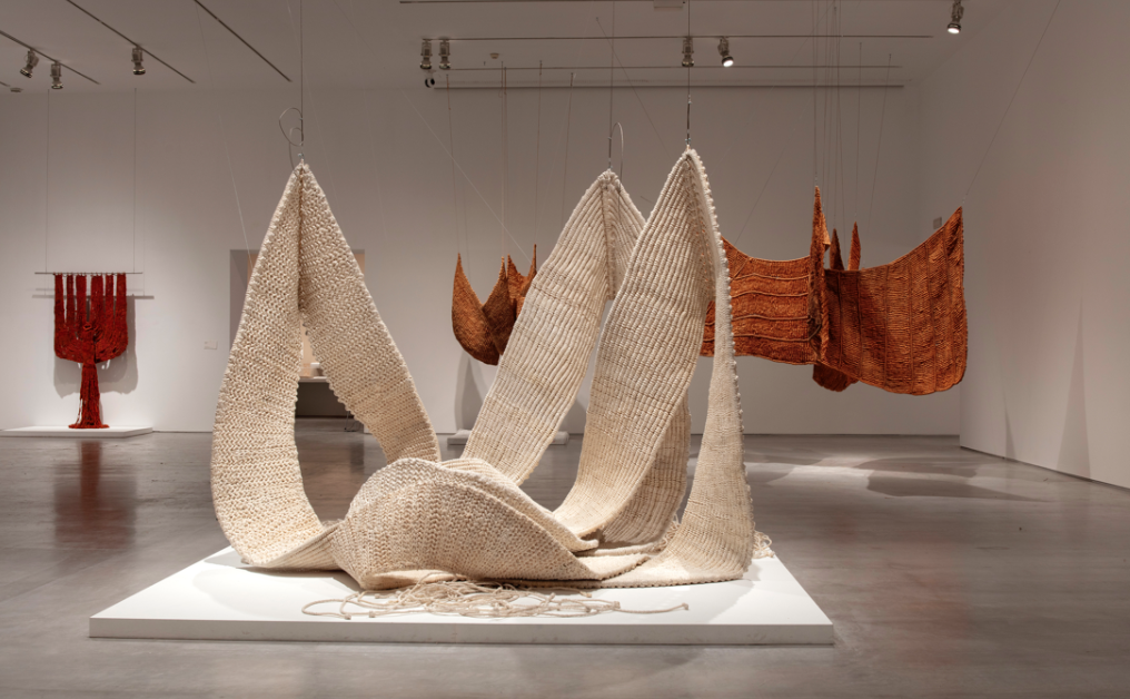 La exposición despliega el universo creativo de la artista a través de seis salas que trazan una evolución coherente y profundamente innovadora. Desde sus primeros bordados de los años sesenta —que tensionan los límites de la pintura— hasta sus célebres macramés de los setenta, en los que el tejido abandona el plano para conquistar el espacio tridimensional, Muñoz desarrolla un lenguaje propio donde lo textil se convierte en arquitectura blanda y organismo vivo.