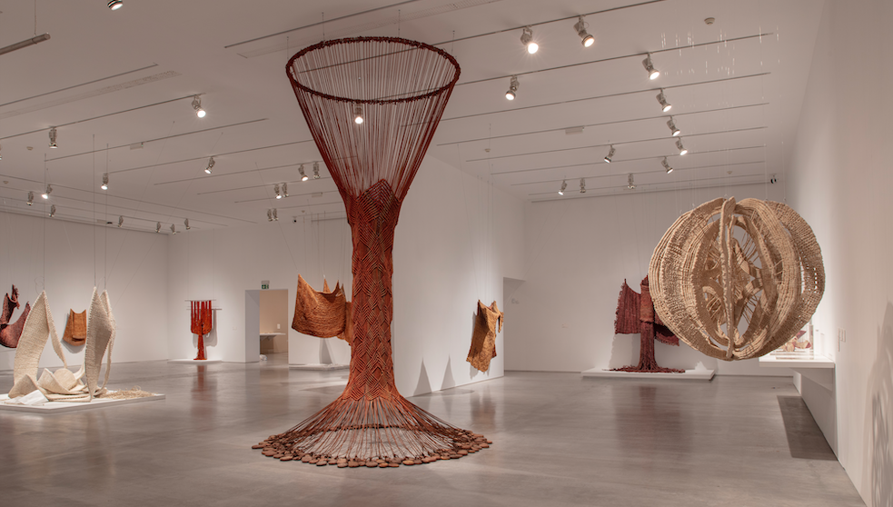 En primer plano: Aurèlia Muñoz, Ondulacions [Ondulaciones], 1974. Macramé de hilos de nailon (240 x 240 x 240 cm). Museo Reina Sofía, Madrid. Fotografía: Fátima Sanz.