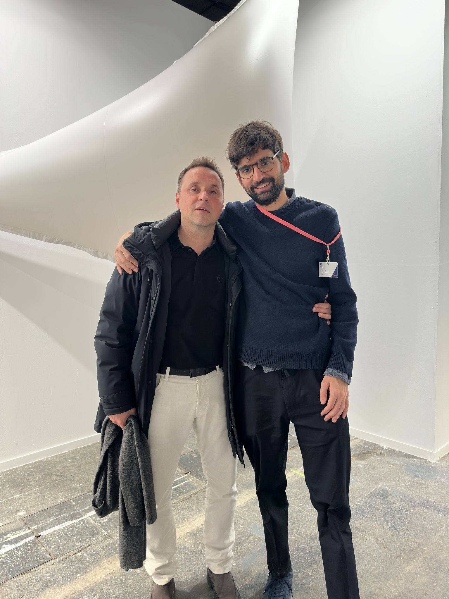 Ricard Planas, ceo de bonart cultural, i Bernat Daviu, artista i socifundador de Bombon Project davant d'una de les escultures de Josep Ponsatí a Arco Madrid.